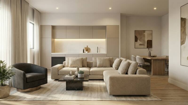 Esta vivienda de 93 m² se distribuye de manera funcional para aprovechar al máximo cada espacio. El salón-comedor con cocina abierta cuenta con vistas hacia la zona del río, ofreciendo una relación directa con el entorno exterior.