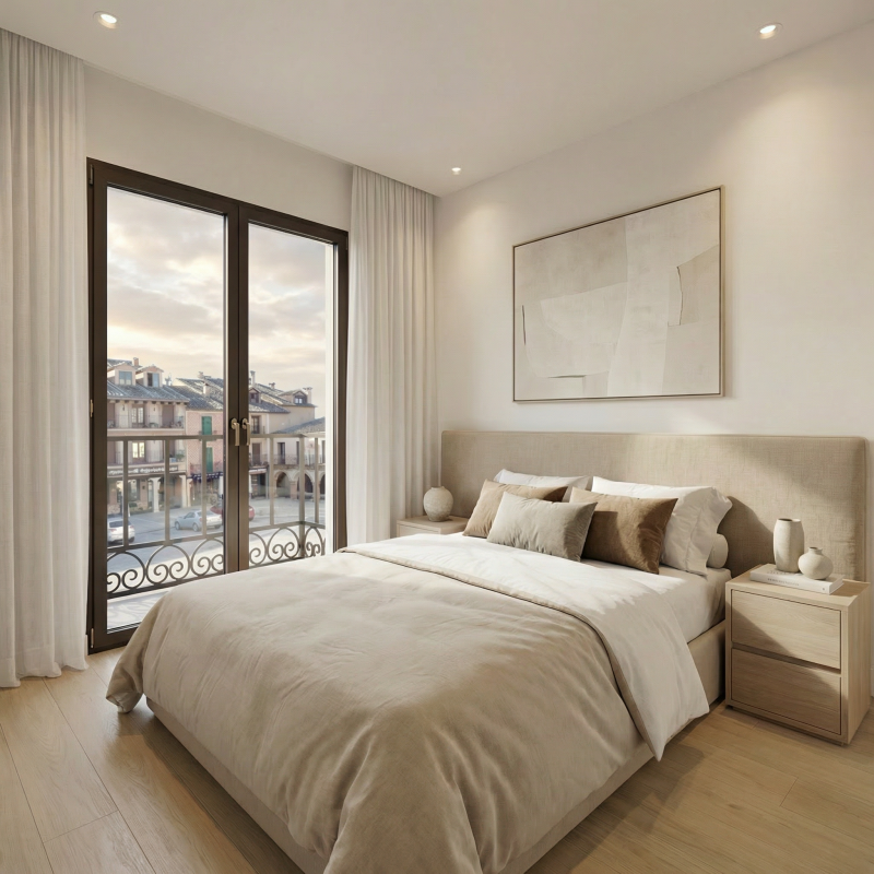 El dormitorio, también con balcón a la plaza, incorpora espacio para armario y mantiene la misma orientación que el salón, unificando el carácter exterior de toda la vivienda. Un baño completo da servicio al conjunto, situado de forma práctica respecto a las estancias principales.